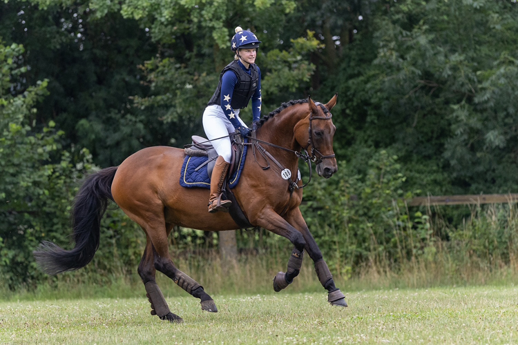 FORRESTINE, Tochter des Tarison und mütterliche Halbschwester zu unserer Frutillar, hat nach ihrer Mutterschaftspause 2024 mit Charlotte Schlierbach im Sattel wieder schöne Platzierungen erzielen können, u. a. in Stil-Geländeritten Kl. A**.
